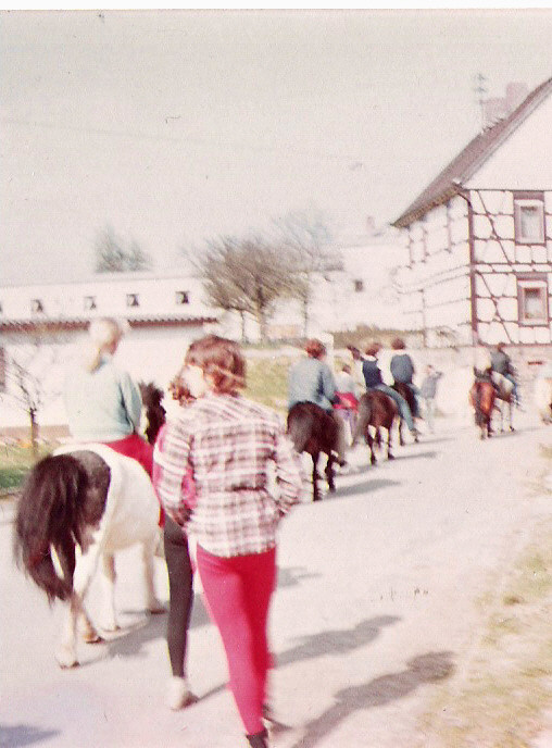 Anfangs ritten die Kinder in einer Scheune und bei schönem Wetter auf dem „Schindkopf“, einer unebenen Wiese. Werner gab Reitunterricht. Sein Lieblingsmotto: Reiten lernt man nur durch Reiten! Sonntags wurde ein Ausflug an die Nidder, einem kleinen Bach im Unterdorf, gemacht.. Hier gab es ein Picknick und die Kinder ritten mit ihren Ponys ins Wasser.
