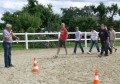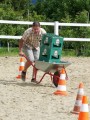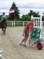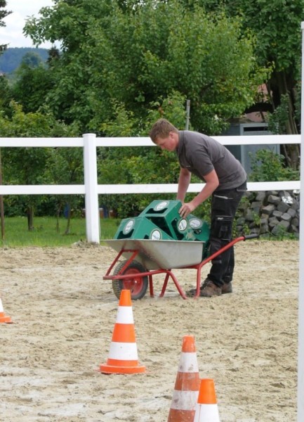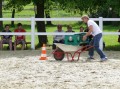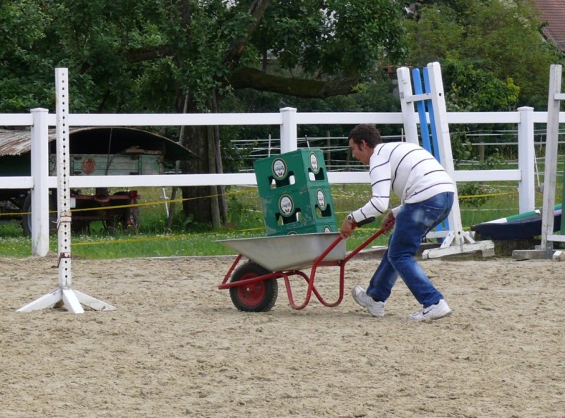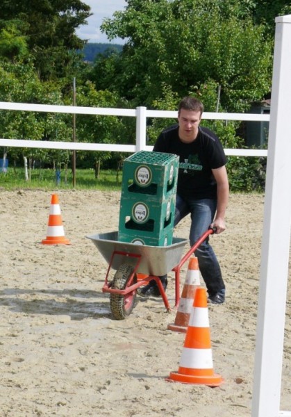 Rasant wurde es noch mal zum Abschluss. Beim Jump & Drive mussten die Reiterinnen ihre Pferde zuerst schnellstmöglich über einen Springparcours steuern, ein Partner schob dann eine mit drei Bierkisten beladene Schubkarre über den Platz ins Ziel. Am schnellsten waren hierbei Sylvia Nos mit ihrem Partner Roy Lambert, gefolgt von Verena Nagelschmidt und Lukas Mühlbauer sowie Sina Kocher und Michael Fisher.