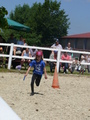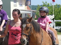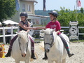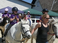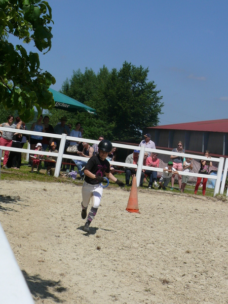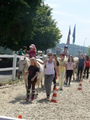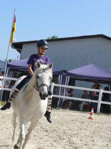 Rasant ging es beim Reiterspiel „Ride and Run“ zu. Zuerst wurde ein Geschicklichkeitsparcours auf dem Pony geritten, dann mußten die Kinder abspringen und so schnell wie möglich zurückrennen. Pia Wagner auf Jinka gelang das am schnellsten, gefolgt von Auguste Stolberg und Elisabeth Wäss.