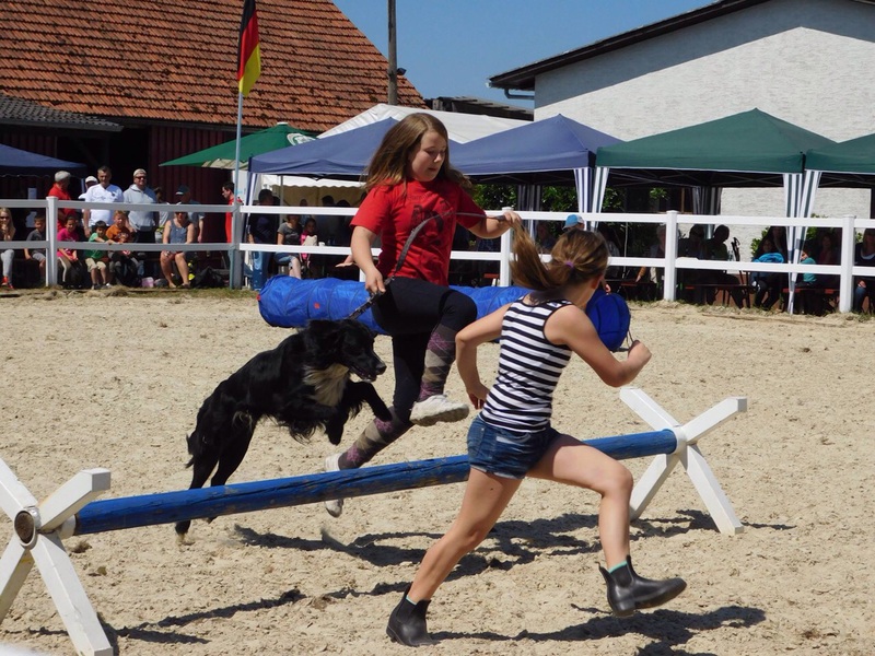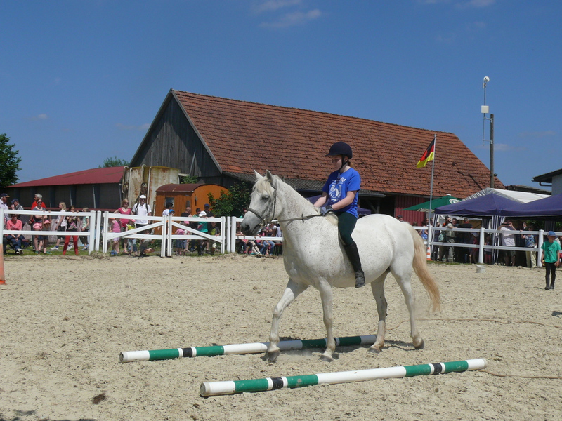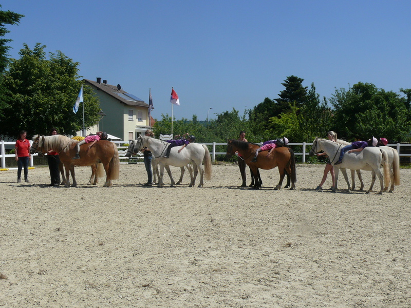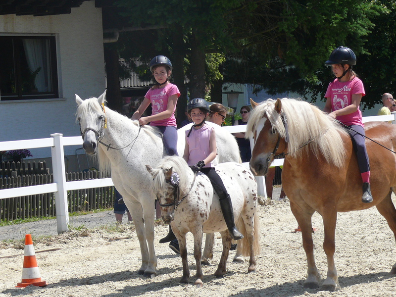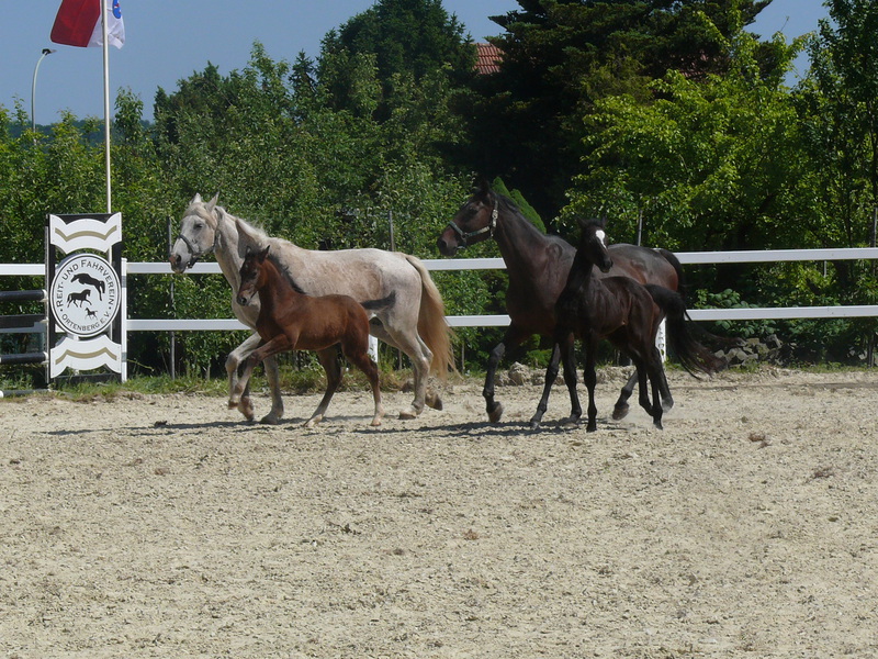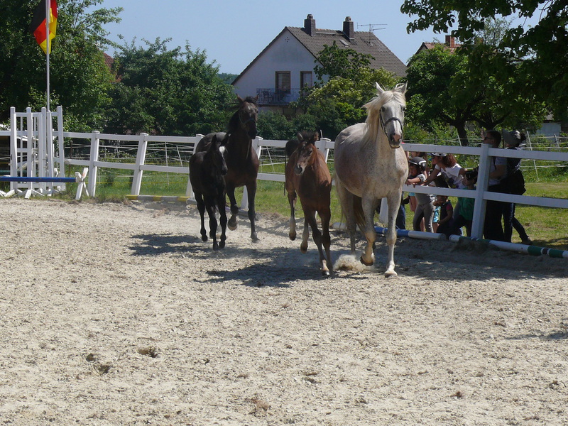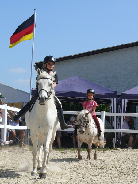 Die jüngsten Reiterinnen und Reiter zeigten anschließend zum Fliegerlied, dass sie sogar schon freihändig reiten können. Marie und Elisabeth Wäß mit ihrem Hund „Socke“ siegten im Hundesportwettbewerb. Danach konnten die Besucher zwei Fohlen mit ihren Müttern, ehemals Erfolgspferde von Sylvia und Steffi Nos, bewundern.