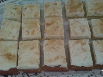 Den Schmand und die Sahne schlagen und die Masse auf den Kuchen streichen.